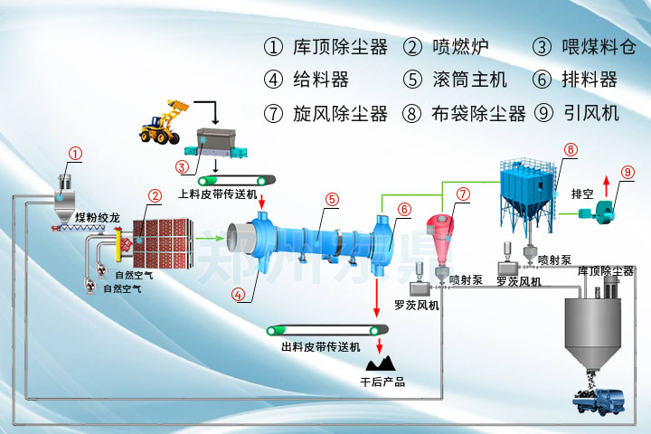 2、采用順流干燥方式,煙氣與濕物料由同一側(cè)進(jìn)入干燥機(jī),可以利用高溫?zé)煔猥@得很高的蒸發(fā)強(qiáng)度,烘干機(jī)出口溫度低,熱效率高;