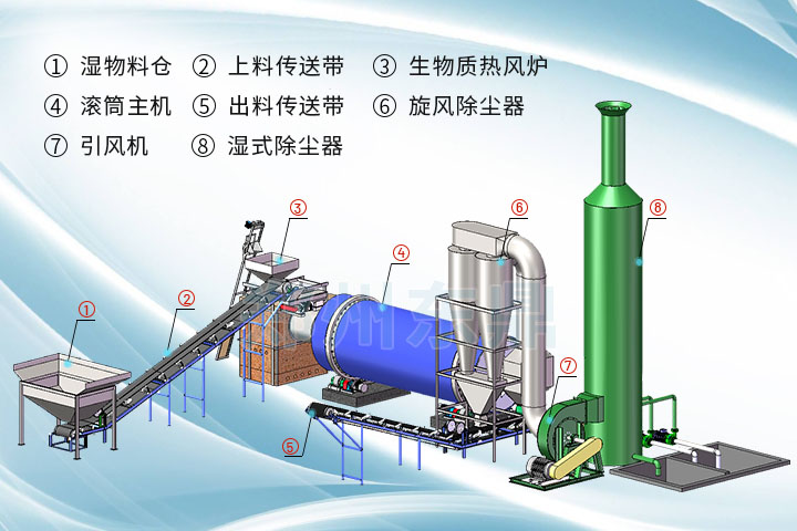 1、熱風(fēng)爐  2、單層或多層滾筒烘干設(shè)備  3、風(fēng)管  4、氣流或旋流干燥器 5、旋風(fēng)除塵器  6、布袋除塵器 7、風(fēng)機(jī)  8、控制柜 9、儲(chǔ)料料倉 10、進(jìn)料皮帶  11、出料皮帶  12、其它配件(脫水、成型、冷卻可根據(jù)實(shí)際情況選配)。